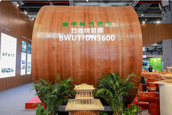 在现场展厅里,一根长6m,直径1m的竹缠绕复合管道吸引了大家的注意,它是“以竹代塑”绿色低碳材料应用的创新与突破,竹缠绕复合管道是世界第一根工业化生产的生物基管道。还有一个直径为3.6m,长3m的竹缠绕管廊,与传统管廊相比,竹缠绕管廊材料成本可降低约10%,安装施工效率可提高约20%。近年来,中林集团不断加强竹缠绕新型复合材料研发,为生物减碳固碳提供重要解决方案。