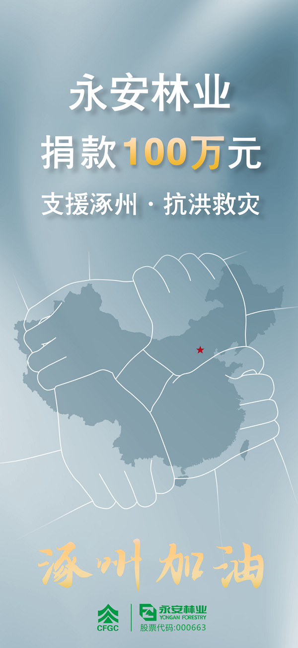 一方有难八方支援,同气连枝守望相助。8月9日,永安林业向涿州市民政局救灾专户捐款人民币100万元,全力支持涿州市救灾保障和灾后重建工作。今后,永安林业将继续以实际行动践行央企控股上市公司社会责任。