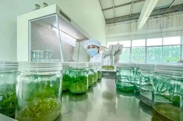 在中林雷林公司属下林业科学研究分公司研发中心无菌室的组培瓶内,一簇簇幼苗吐着嫩绿的芽儿;无菌室外的苗圃基地里,一畦畦红红绿绿的树苗舒展着枝叶,接受着阳光雨露的洗礼……